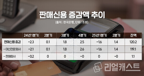다만, 판매신용 잔액이 가계대출(1832조 6000억 원)에 비해서는 적지만 120조가 넘는 큰 금액이기 때문에 여기서 부실이 발생할 경우 금융기관의 실적에 크게 부담을 지울 수 있습니다.