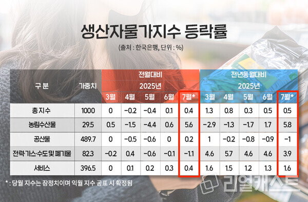 21일 한국은행이 발표한 7월 생산자물가지수는 6월 대비 0.4% 오른 것으로 나타났습니다.