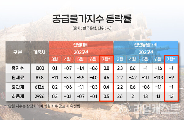 생산자물가지수와 수입물가지수를 결합해 산출하는 공급물가지수는 6월보다 0.8% 상승하며 4개월만에 상승반전 했습니다. 원재료(4.6%)를 비롯해 중간재 및 최종재 모두 각각 0.4%, 0.5% 오른 것으로 확인됐습니다.