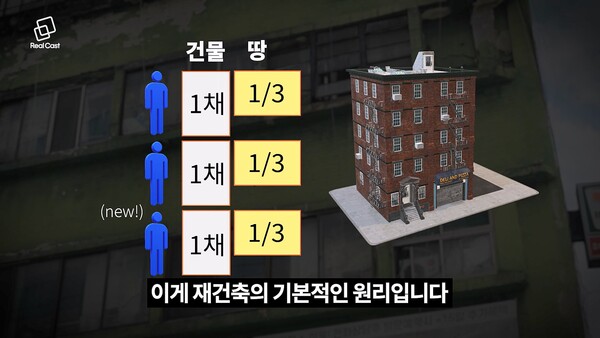 이렇게 빌린 돈은 새로운 이웃이 갚아줍니다. 새로 지은 아파트는 기존보다 세대수가 많은데, 기존 소유자들이 가져가고 남은 아파트를 새로운 이웃들에게 팔아서 비용을 충당하는 겁니다. 새 이웃들은 기존 소유자들이 보유한 땅 지분을 나누어 받으면서 새로운 구분 소유자로 편입되게 됩니다. 이게 재건축의 기본적인 원리입니다.