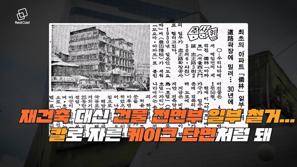 이때 결국 궁여지책으로 선택된 게 건물 전면부 일부를 철거하는 방법입니다. 그래서 지금 충정아파트 전면이 식칼로 자른 케이크 단면 꼴이 된 겁니다.