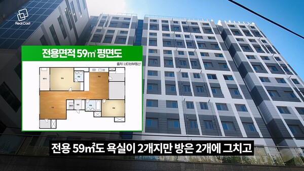 이 단지는 1동짜리 나홀로 아파트로서, 평면 구성은 오피스텔에 가깝다는 평가입니다. 가장 작은 12~13평 평면은 분리형 원룸에 가까운 스튜디오형 구조고요. 전용 59㎡도 욕실이 2개지만 방은 2개에 그치고, 동선도 깔끔하지 않은 편입니다.