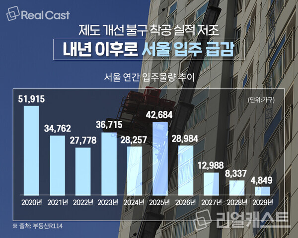 부동산R114에 따르면 올해 서울 입주물량은 4만2,684가구며 2026년 2만 8,984가구, 2027년 1만 2,988가구로 줄어들며 2028년에는 8,337가구로 1만 가구를 밑돌 전망입니다. 착공이 더 많았다면 입주물량 감소폭은 줄었을 것입니다.