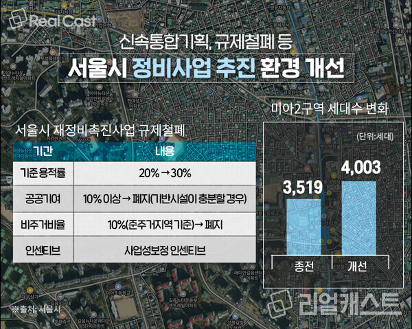 최근 10년 이상 사업이 답보상태에 머물러 있던 미아2구역이 규제철폐 1호 대상지로 선정, 용적률이 크게 개선돼 사업 추진에 탄력이 생겼습니다. 종전 규정대로라면 3,519세대를 지을 수 있었지만 용적률 상향으로 4,003가구를 짓게 돼 사업성이 개선됐습니다.