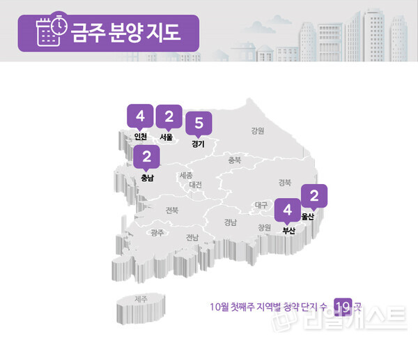 부동산인포에 따르면 10월 1주 전국에서 신규 청약 및 입주자를 모집하는 곳은 19곳, 총 1만5008가구로 집계됐습니다(총 가구 수 기준).