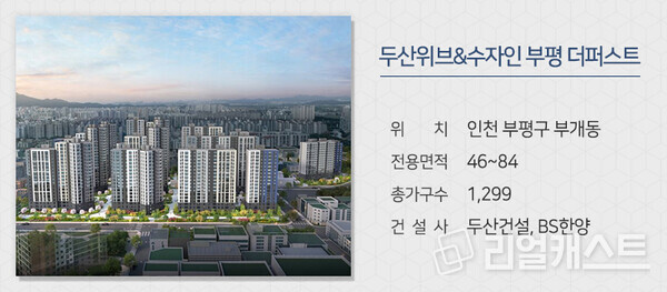 두산건설과 BS한양 컨소시엄이 인천 부평구 부개4구역을 재개발해 짓는 '두산위브&수자인 부평 더퍼스트'를 분양합니다. 지하철 7호선 굴포천역을 걸어서 이용할 수 있어 서울 가산디지털단지와 강남으로 환승없이 이동이 가능합니다. 롯데마트, 현대백화점, 부평시장, 성모병원 등의 생활 인프라를 갖췄습니다. 삼성물산의 주거 플랫폼 '홈닉(Homeniq)'이 적용되며 외관은 커튼월룩, 유리난관 등의 특화 설계가 적용됩니다.