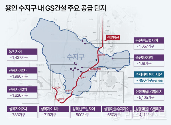 부동산시장 분석업체 부동산인포에 따르면 2025년 9월 기준, 용인 수지구 내 공급 아파트 11만2,072가구 가운데 GS건설이 건설한 아파트는 총 1만7,404가구로 전체 아파트의 15.5%를 차지한다. 차순위인 현대건설(1만1,908가구)보다 5,496가구가 많은 수준이며 삼성물산(8,043가구) 보다는 2배 이상 많은 수준이다.