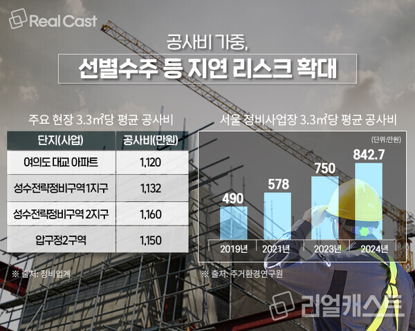 하지만 주거환경연구원에 따르면 서울 정비사업의 3.3㎡당 공사비는 2019년 490만 원, 2021년 578만 원, 2024년 842만 원으로 치솟았습니다. 그뿐만 아니라 성수, 여의도, 압구정 같은 지역은 1,100만~1,200만 원 수준이 일반화됐습니다.