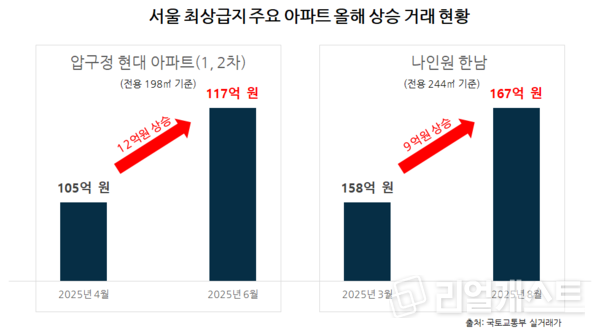 강남 압구정 현대아파트 전용 198㎡는 지난 4월 105억 원에 거래된 후 최근에는 117억8,000만 원으로 또 다시 고점을 찍었다.이외에 한남동 ‘나인원한남’도 전용 244㎡가 3월 158억 원, 8월 167억 원에 거래되며 기록을 새로 썼다.