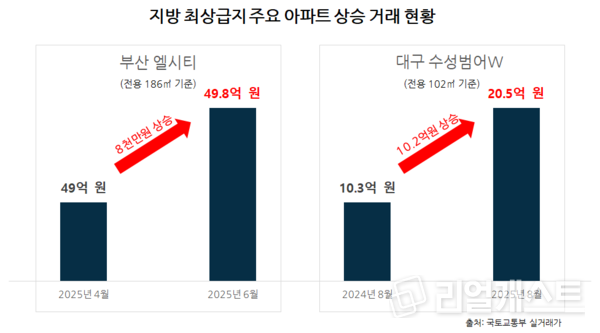 지방 부촌도 신고가 행진이 이어지고 있다. 부산 해운대구 ‘엘시티’ 전용 186㎡는 올해 4월 49억8,000만 원에 거래되며 신고가를 갈아치웠고, ‘마린시티자이’ 전용 84㎡도 7월 14억7,000만 원으로 최고가를 새로 썼다. 또한 대구 수성구 ‘수성범어W’ 전용 102㎡는 지난 8월 20억5,000만 원에 거래돼 직전 거래가의 두 배를 웃돌았다.