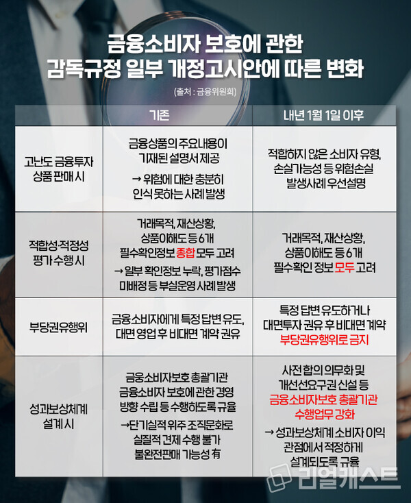 금번 개정을 통해 금융회사들이 소비자 투자성향판단 과정에서 손실감내수준이 낮은 소비자가 ELS와 같은 고위험상품에 가입하게 하거나, 대면 영업 후 녹취의무와 판매직원 안내가 없는 비대면 계약을 권유하는 것을 막을 것으로 기대됩니다.