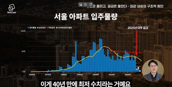 서울의 공급 부족은 이 흐름을 더욱 심화시키고 있습니다. 통상 서울은 연간 5만 세대 이상 신규 아파트가 공급되어야 가격이 안정된다고 알려져 있습니다. 하지만 최근 몇 년간 이 기준을 충족한 적은 거의 없습니다. 올해 서울의 신규 입주 물량은 3만 5천 가구에 불과하며, 내년부터는 연 1만 호 이하로 떨어질 전망입니다. 이는 40년 만의 최저 수준이며, 앞으로 최소 3년간 이 흐름이 지속될 것으로 보입니다.