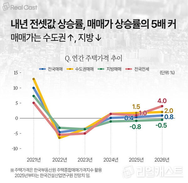 한국건설산업연구원(건산연)은 4일 개최한 ‘2026년 건설·자재·부동산 경기전망 세미나’에서 내년 전국의 주택 전셋값이 올해(1% 상승 예상)보다 4배 높은 4.0% 상승할 것으로 전망했습니다. 같은 기간 주택 매매가격은 0.8% 상승에 그칠 것으로 예측 해 전셋값이 매매가 상승폭의 약 5배 가량 높을 것으로 내다봤습니다.