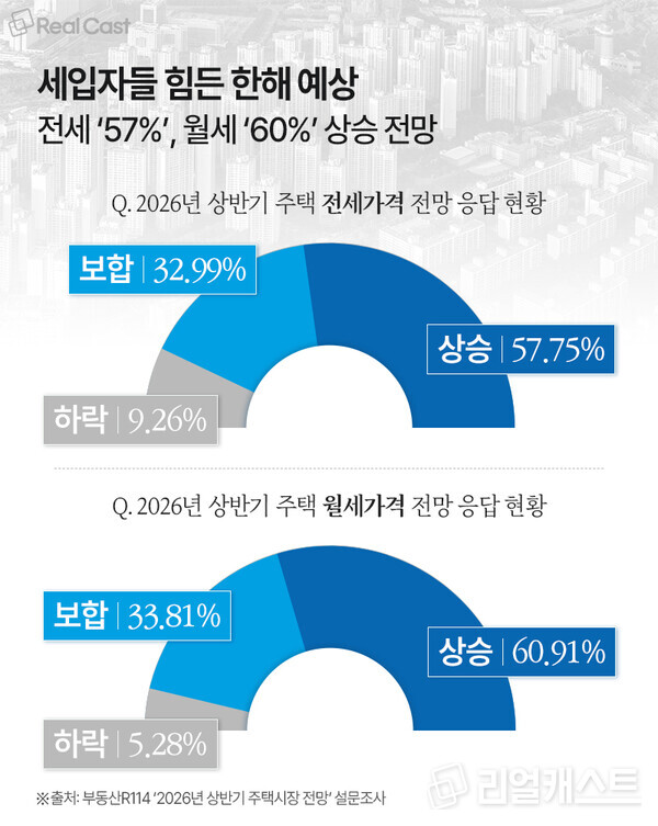 전셋값이 오른다는 응답자는 57.75%로 ‘내린다(9.26%)’를 크게 앞질렀으며 ‘월세가 오른다’는 응답자는 60.91%에 달했습니다.
