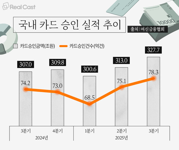 올해 3분기 전국 카드 승인 금액과 승인 건수가 모두 큰 폭으로 늘어나며 소비 심리가 본격적인 반등세를 나타냈습니다. 최근 여신금융협회가 발표한 ‘2025년 3분기 전국 카드 승인 실적 분석’에 따르면, 전체 카드 승인 금액은 327조7,000억원을 기록했습니다.