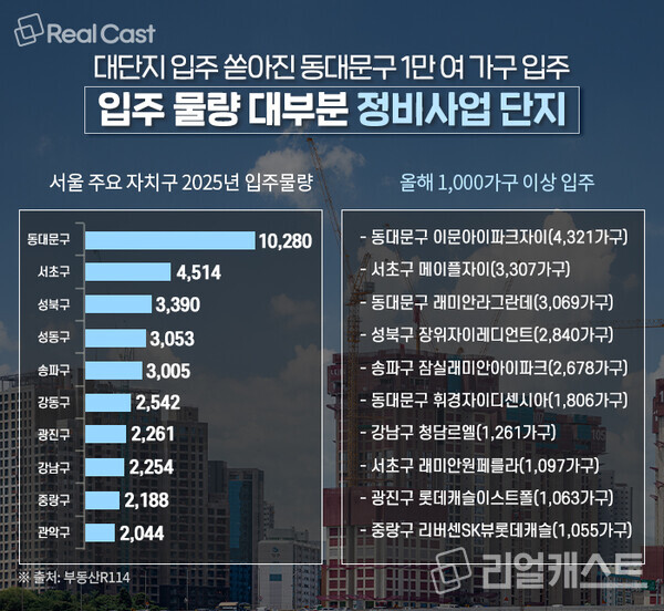 올해는 이문아이파크자이(4,321가구), 래미안라그란데(3,069가구), 휘경자이디센시아(1,806가구) 등이 입주하는 동대문구가 총 1만 280가구로 입주 물량이 가장 많고 메이플자이(3,307가구)가 입주한 서초구가 4,514가구 입주로 뒤를 따릅니다. 이외에도 재건축, 재개발 정비사업 대단지들이 입주하는 송파구(3,005가구), 성북구(3,390가구) 등도 평년보다 입주가 많은 편입니다.