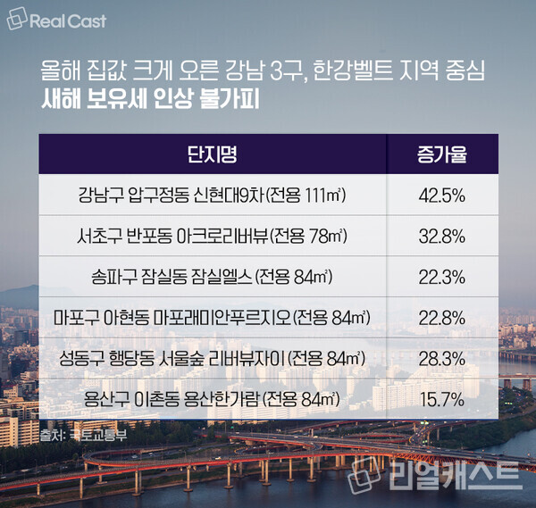 또한 서초구 반포동 아크로리버뷰(전용 78㎡) 보유세는 32.8% 증가해서 1,599만 원, 송파구 잠실동 잠실엘스(전용 84㎡)는 22.3%가 증가합니다.