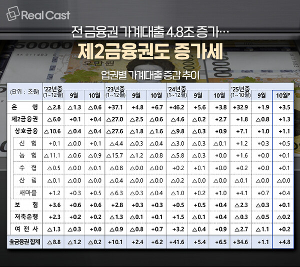 금융위원회가 13일 발표한 ‘2025년 10월중 가계대출 동향(잠정)’에 따르면 10월 전체 금융권 가계대출은 4조 8000억원 늘어 전년 동월(6조 5000억원)보다는 증가 폭이 작지만, 전달의 4배 수준으로 증가세가 크게 확대됐습니다. 집단대출과 중도금 대출이 일시에 집중된 영향과 함께 투자·소비 자금 수요가 동시에 늘어난 것이 원인으로 분석됩니다.