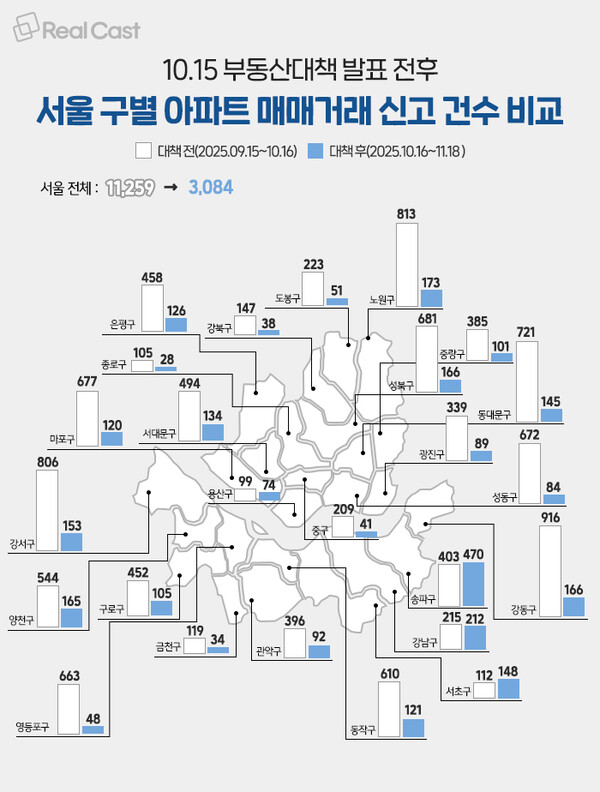 국토부 실거래가 공개시스템에 따르면, 10.15 부동산 대책이 발표된 다음 날인 10월 16일부터 11월 18일 현재까지 서울 아파트 매매 거래건수는 총 3,084건으로 조사됐습니다. 이는 대책 발표 한달 전인 9월 16일부터 10월 15일까지 1만1,259건의 27.4% 수준으로 줄어든 것입니다.