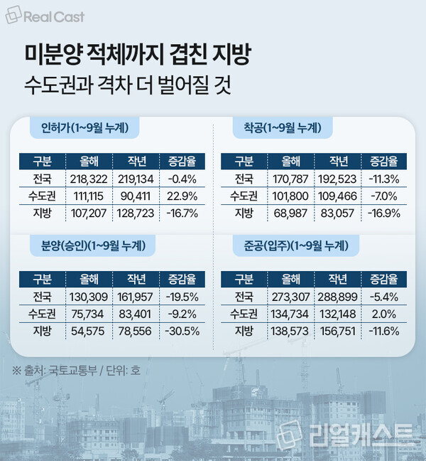 착공도 지방은 16.9% 감소하며 수도권 감소(7.0%)보다 두 배 이상 감소 폭이 컸습니다.