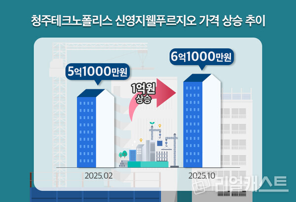 이는 아파트 실거래에도 반영돼 ‘청주테크노폴리스 신영지웰푸르지오’ 전용 84㎡는 10월 6억1,000만원에 거래되며 올 2월 대비 약 1억원 상승한 것으로 나타났다.