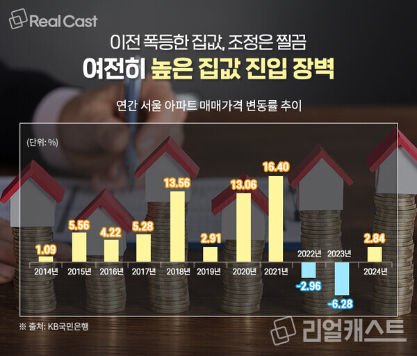 2022~2023년 사이에는 기준금리의 급격한 인상으로 하락했던 시기도 있었지만 워낙 이전에 가격이 크게 올랐던 터라 하락을 체감하기는 쉽지 않았고, 여전히 서울 집값은 ‘진입 장벽’이 높게 세워져 있습니다.