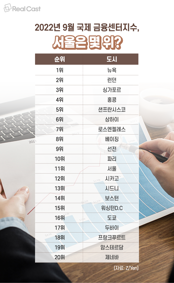 영국 컨설틴 그룹인 지옌(Z/Yen)dl 지난해 9월 발표한 국제 금융센터지수에서 서울은 128개 도시 중 11위, 부산은 29위를 기록했습니다. 같은 해 3월 12위였던 서울과 30위를 기록했던 부산 둘 다 한 단계 더 상승한 모습을 보였는데요. 128개 도시 중 11위에 올랐다는 것은 쾌거입니다. 하지만 아직 서울은 홍콩, 상하이, 싱가포르 등의 나라보다 순위가 낮아 아시아의 금융중심지가 되긴 어려운 상황이죠.